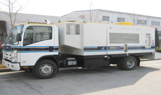 该类设备主要是通过输出低压、大流量压缩空气直接启动飞机发动机,也可给飞机进行辅助供气,用于飞机检查或空调。该设备由汽车底盘、压缩机机组、罩壳总成、供气总成和电气系统组成。